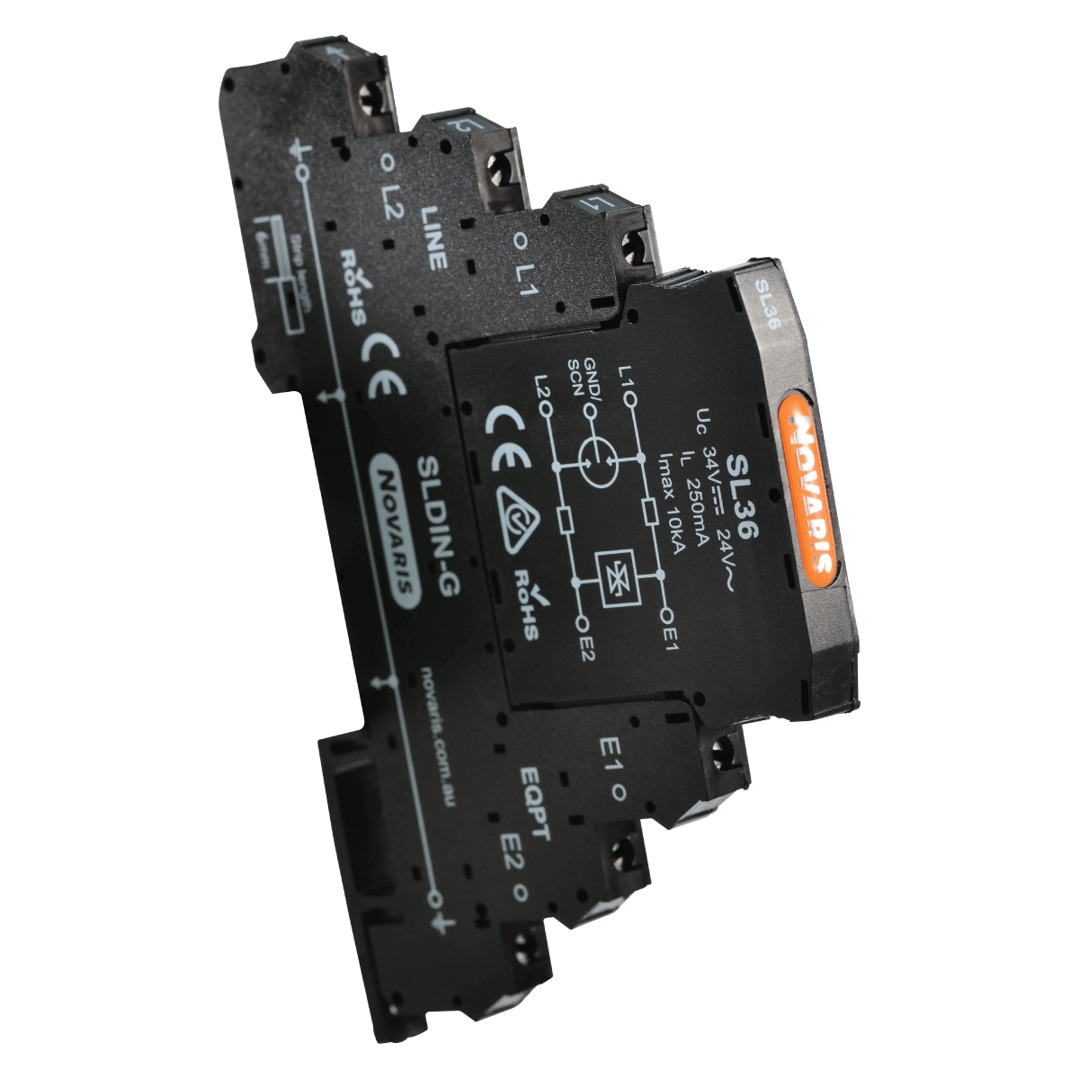 Novaris SL plug-in signal line protectors provide surge protection for most twisted pair signalling schemes. They are ideal for the protection of PLCs, fire and security systems, telecommunications, telemetry systems, SCADA and other industrial monitoring and control equipment.
